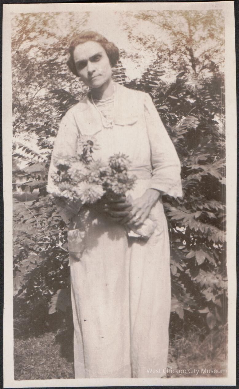 From Facebook posting of this image March 20, 2023: "This images is of Jessie May Hayward Benjamin holding a wonderful bouquet of flowers in front of her family home at 444 Claremont Street.