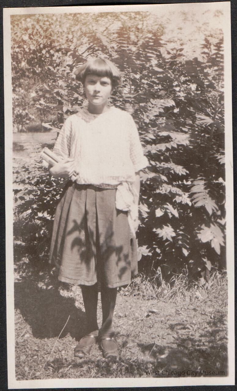 Photograph, black and white, showing "Frances" standing in front of bush first day of school, dated 9.10.1923. She is wearing a short sleeved loose shirt with a loose tie at the waist, pain dark skirt, dark stockings and shoes. Her hair is bobbed.