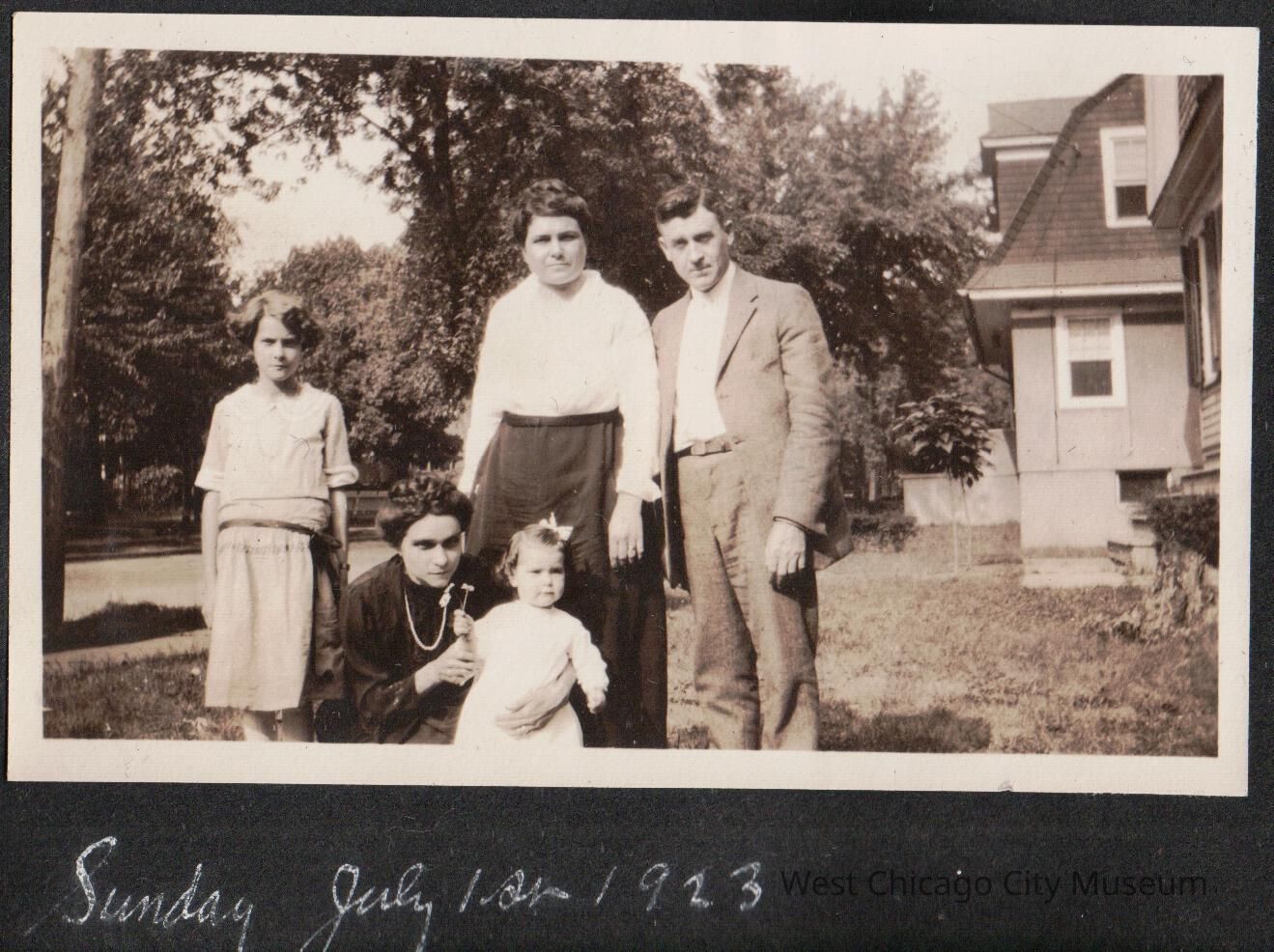 Two women, man, and two children on a front lawn of a house. The photo is taken so it looks down the street with 1920s style homes. The man and woman in a white blouse are standing, the woman in a black blouse (possibly Jessie Benjamin_ is crouched with her arm around a toddler (likely Arleen Alexander Rooney.) Standing behind the toddler are likely her parents Bertha and Harrison Alexander. There is a girl to the left, about 12 years old in a drop waisted dress. Alexander family photograph, from scrapbook.