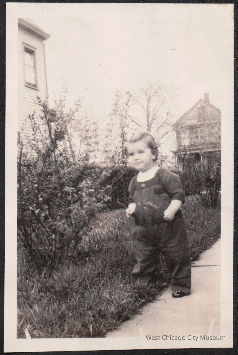Photograph, Black and white, portrait orientation, showing Arleen Alexander as a toddler standing unsteadily on the grass and sidewalk in front of some bushes. She is wearing what appears to be rompers or a union style suite with long sleeves and pant legs. She hair is curled and has a bow in it. She is has a bit of the bush in her hand. Pasted on a black sheet of paper in an album, and dated 4/29/2023. From the Alexander family album