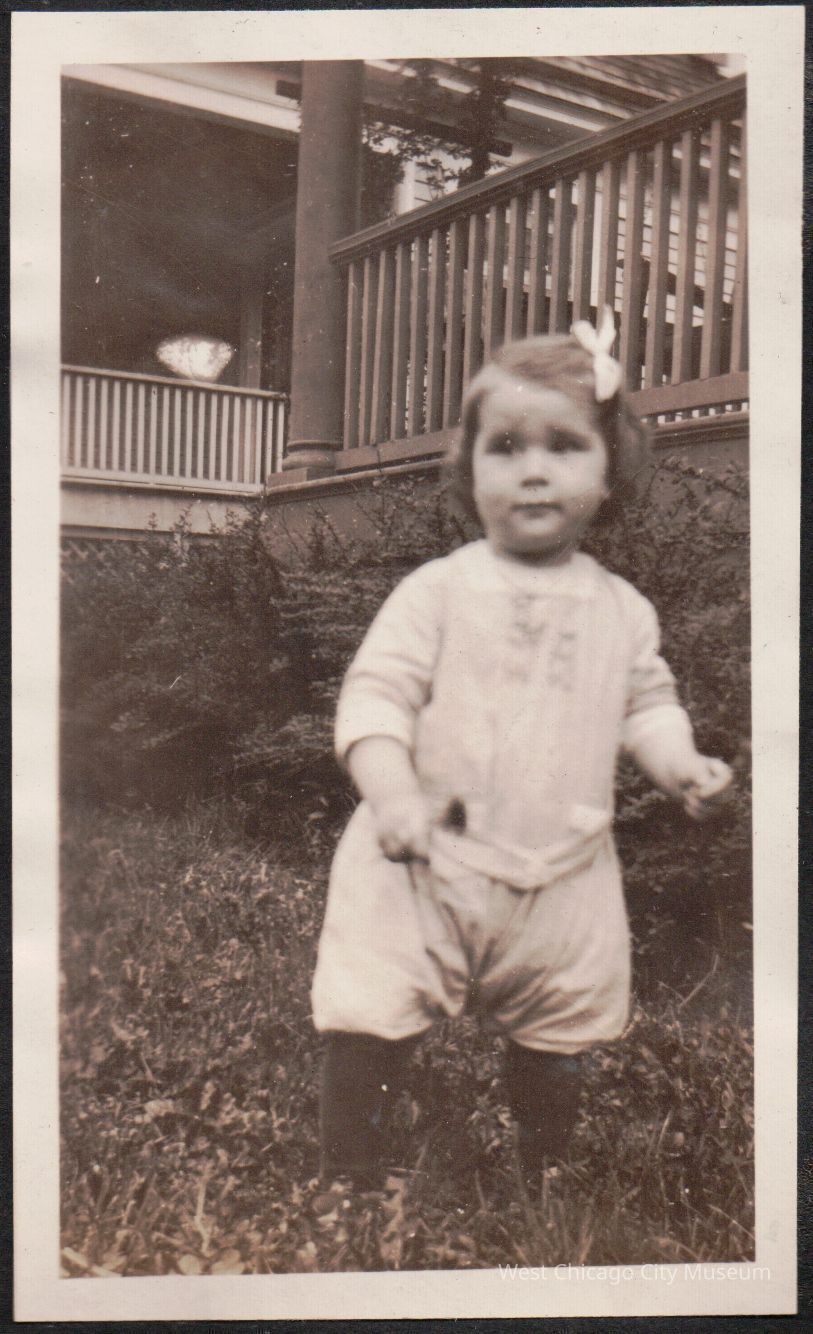 Photograph, Black and white, portrait orientation, showing Arleen Alexander as a toddler, in a pair of rompers and black stockings standing in the lawn in front of a porch. There are bushes behind her. Pasted on a black sheet of paper in an album, and dated 4/29/2023. From the Alexander family album