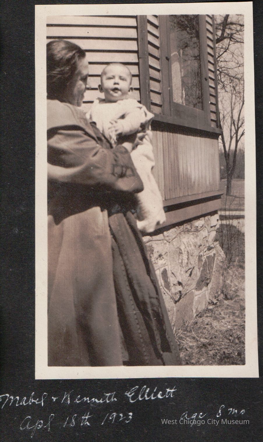 She is wearing a coat. They are standing by a home with siding and a stone foundation. Pasted on black scrapbook paper, and written below in white is "Mabel & Kenneth Elliot Apr 18th 1923" From the Alexander family albumPhotograph Details
