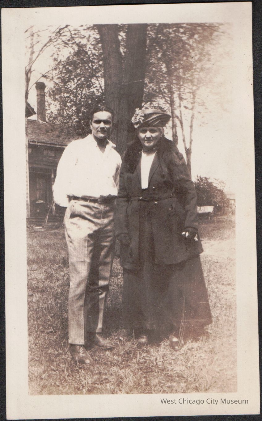 Photograph, Black and white, portrait orientation, showing a young man and an elderly woman standing outside side by side. The man (likely Clarence Hayward) is in light colored slacks and shirt; the shirt is open at the neck and his collar is popped up. The older woman (possibly Fredericka Hayward, his mother - see note) is wearing a coat with a fur trimmed collar and hat. Pasted on black scrapbook paper, identified as Spring, 1923. From the Alexander family albumPhotograph Details