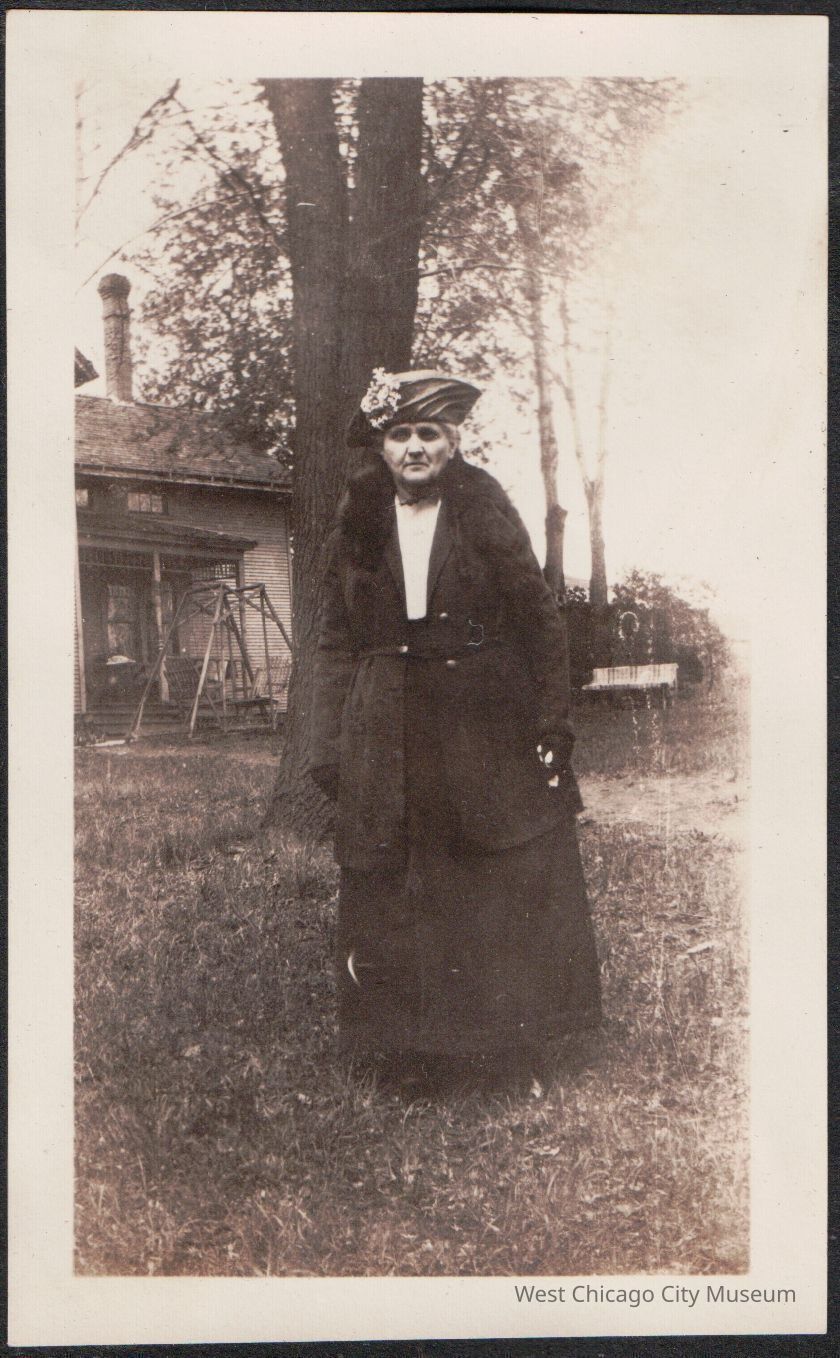 Photograph, Black and white, portrait orientation, showing an older woman, likely Fredericka Hayward, standing outside. She is wearing is wearing a coat with a fur trimmed collar and hat with upturned brim and flowers. Pasted on black scrapbook paper, identified as Spring, 1923. From the Alexander family albumPhotograph Details
