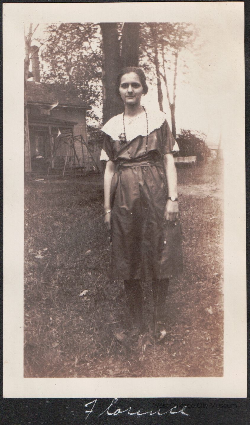 Photograph, Black and white, portrait orientation, showing "Florence", a teenaged girl in a dark dress, short sleeves with a wide lace collar and lace decoration on sleeves. She is wearing a bracelet and a watch, and long necklace. Her hair is loosely pulled back. A home and a wooden swing are visible behind her. Pasted into a album, reads "Florence" in white below. From the Alexander family albumPhotograph Details