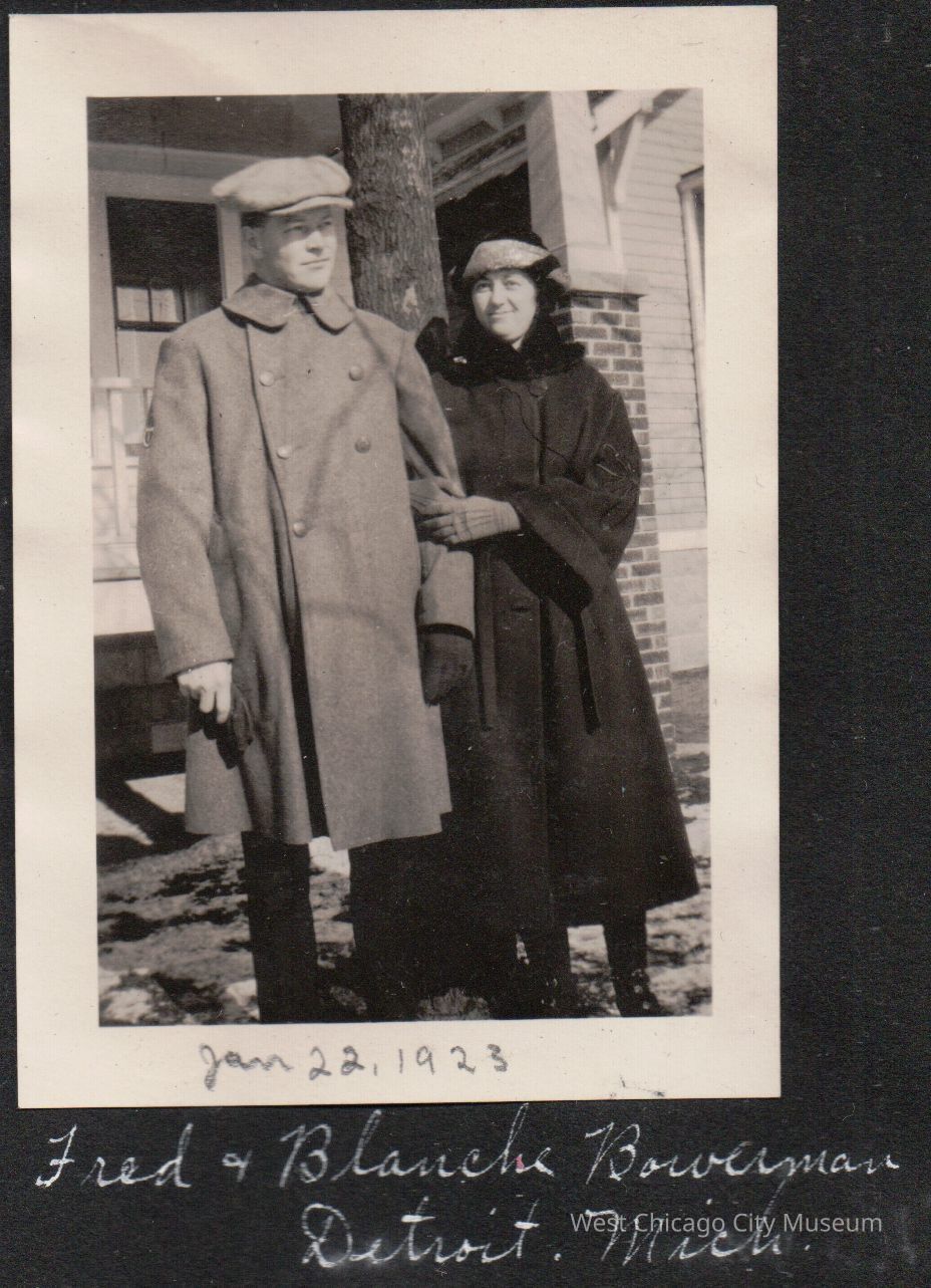 Photograph, Black and white, portrait orientation, showing Fred and Blanche Bowerman standing outside in the sun, in front of a home with a brick porch. Fred is wearing a driving coat and hat, Blanche is wearing a dark coat with fur trim collar and hat with upturned brim. Pasted into a album, reads "Jan 22. 1923" at bottom of the picture, and "Fred & Blanche Bowerman Detroit, Mich" in white below. From the Alexander family albumPhotograph Details