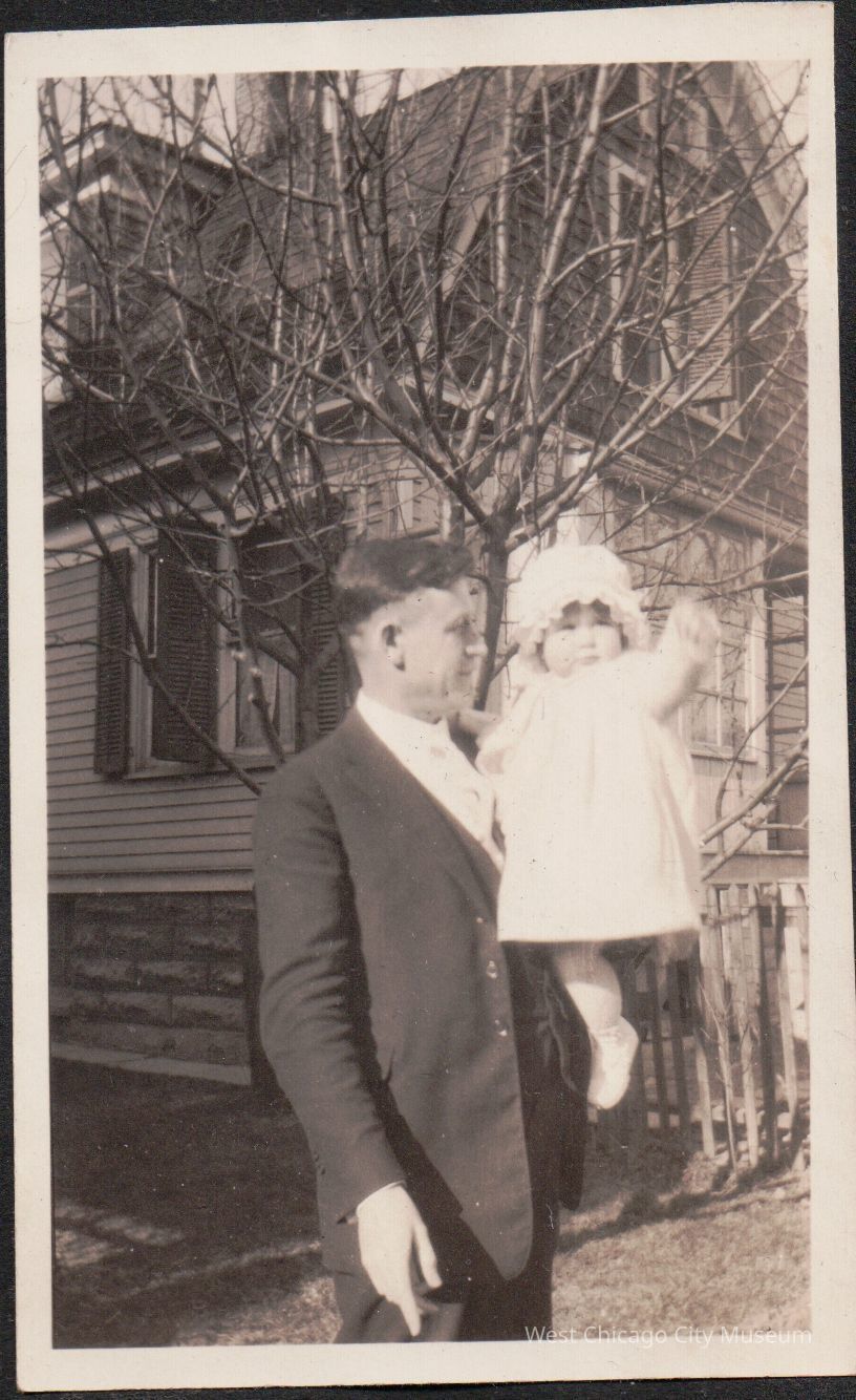 Photograph, Black and white, portrait orientation, showing Arleen Alexander as a infant being held by her father Harrison. They are standing outside, and there is a home behind them. Arleen is wearing a white coat and a frilly white bonnet. It's a sunny early spring day. pasted on black scrapbook paper. Dated 4/1/1923 From the Alexander family album