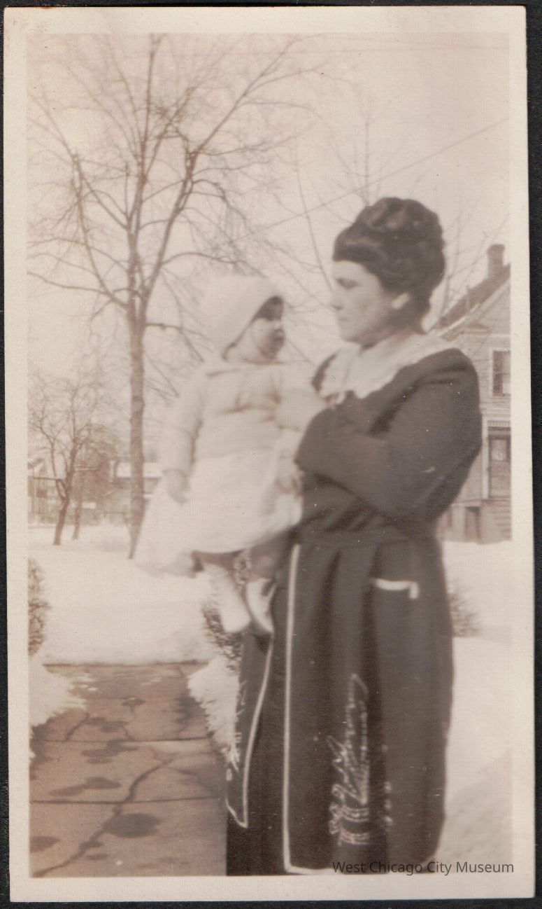 Photograph, Black and white, portrait orientation, showing Arleen Alexander being held by her mother Bertha outside. Arleen is bundled up in white, and Bertha is wearing a dark dress. They are looking at each other. There is snow on the ground, trees are bare, and there is a hour back right of photo. The photo is pasted on black scrapbook paper. Dated 2/11/1923. From the Alexander family albumPhotograph Details