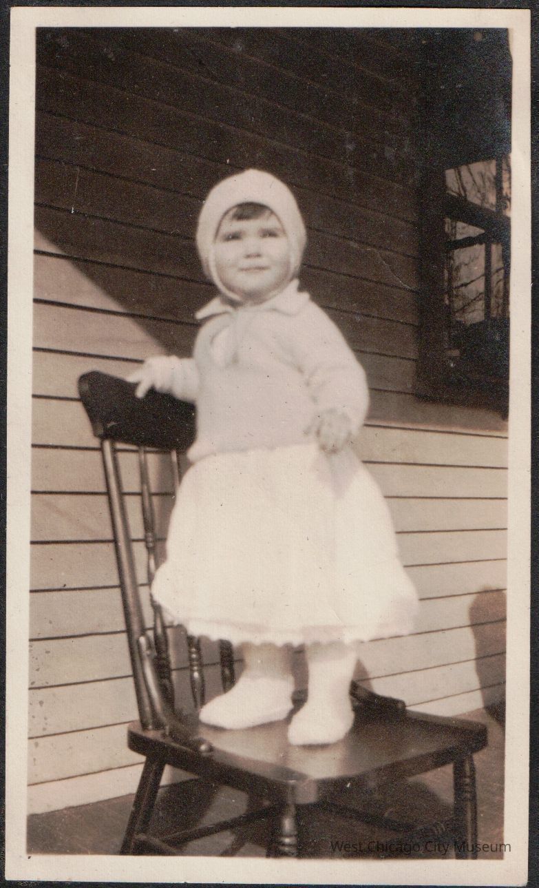 Photograph, Black and white, portrait orientation, showing Arleen Alexander as an infant on a wooden chair on a porch. She is bundled up is a full skirt, jacket and tied hat. The photo is pasted on black scrapbook paper. Dated 2/11/1923. From the Alexander family album