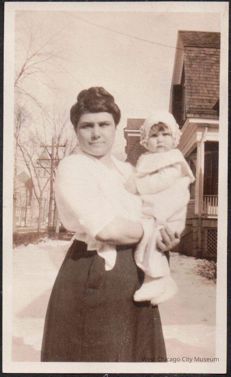Photograph, Black and white, portrait orientation, showing Arleen Alexander being held by her mother Bertha. They are standing on a sidewalk. It is winter, and there is snow on the ground. There are houses on the right side of the photo, and telephone poles / electrical lines on the left. It is winter, but a sunny day. Arleen is wearing a tied bonnet with flowers (crocheted?) and long light colored coat. The photo is pasted on black scrapbook paper. Dated 3/11/1923. From the Alexander family albumPhotograph Details
