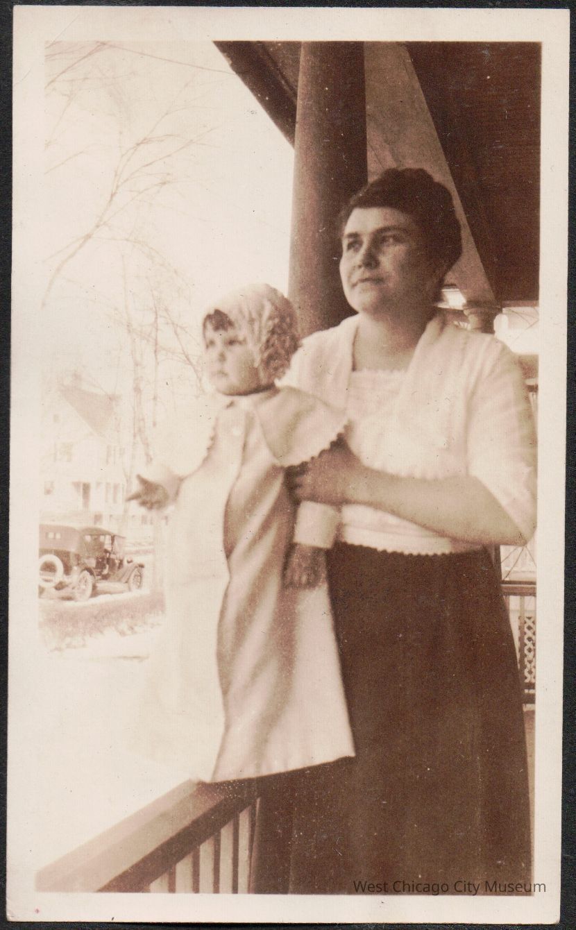 Photograph, Black and white, portrait orientation, showing Arleen Alexander being studied by her mother Bertha as Arleen stands on the railing of the porch. It is winter, and there is snow on the ground. There are houses across the street and a car parked on the street (left side of photo). It is winter, but a sunny day. Arleen is wearing a tied bonnet with flowers (crocheted?) and long light colored coat. The photo is pasted on black scrapbook paper. Dated 3/11/1923. From the Alexander family album