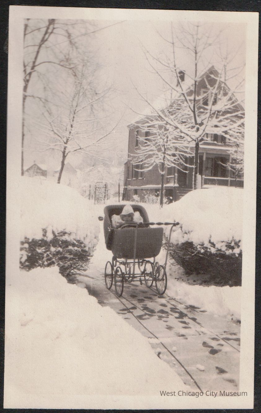 Photograph, Black and white, portrait orientation, showing Arleen Alexander as an infant in a wicker baby buggy bundled up on the sidewalk between two snow covered bushes. There is a house back right or photo. She is looking at the camera. There is a large amount of snow on the ground. The photo is pasted on black scrapbook paper. From series of photos with information "First real snowstorm Jan 4, 1923". From the Alexander family album