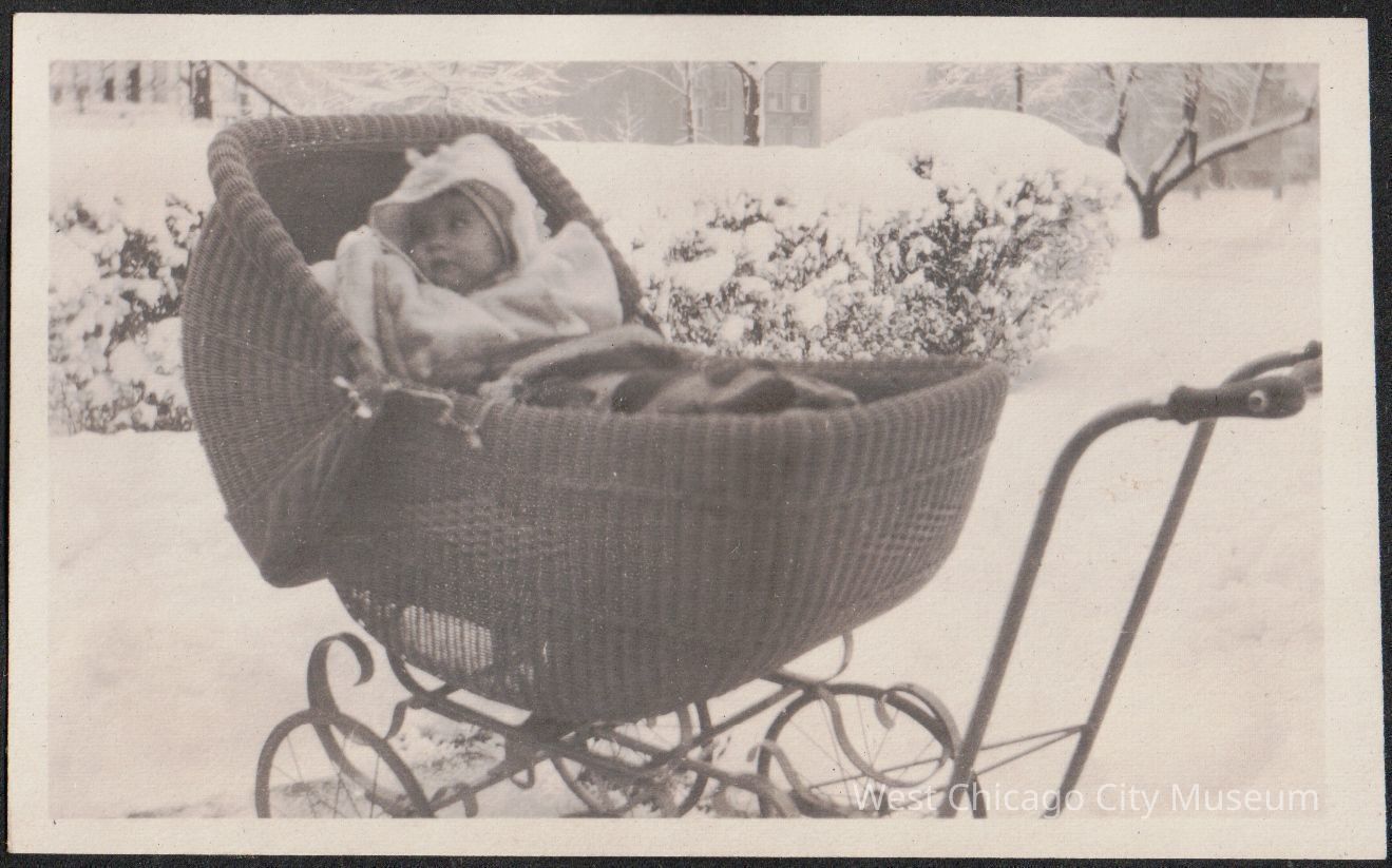 Photograph, Black and white, portrait orientation, showing Arleen Alexander as an infant in a wicker baby buggy bundled up in front of a row of snow covered hedges. She is looking left. There is snow on the ground. The photo is pasted on black scrapbook paper. From series of photos with information "First real snowstorm Jan 4, 1923". From the Alexander family album