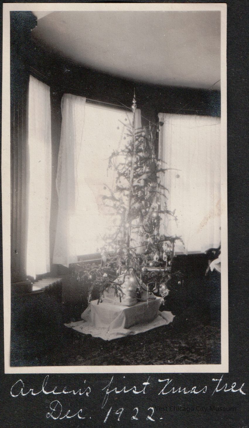 Photograph, black and white, showing a small Christmas tree with sparse needles on a wrapped platform in front of a set of windows with light curtains. The tree is draped with tinsel garland and ornaments. The photo is pasted on black paper and below it in white it reads "Arleen's first Xmas tree Dec. 1922" From the Alexander Family Album, likely the home of Harrison and Bertha Alexander