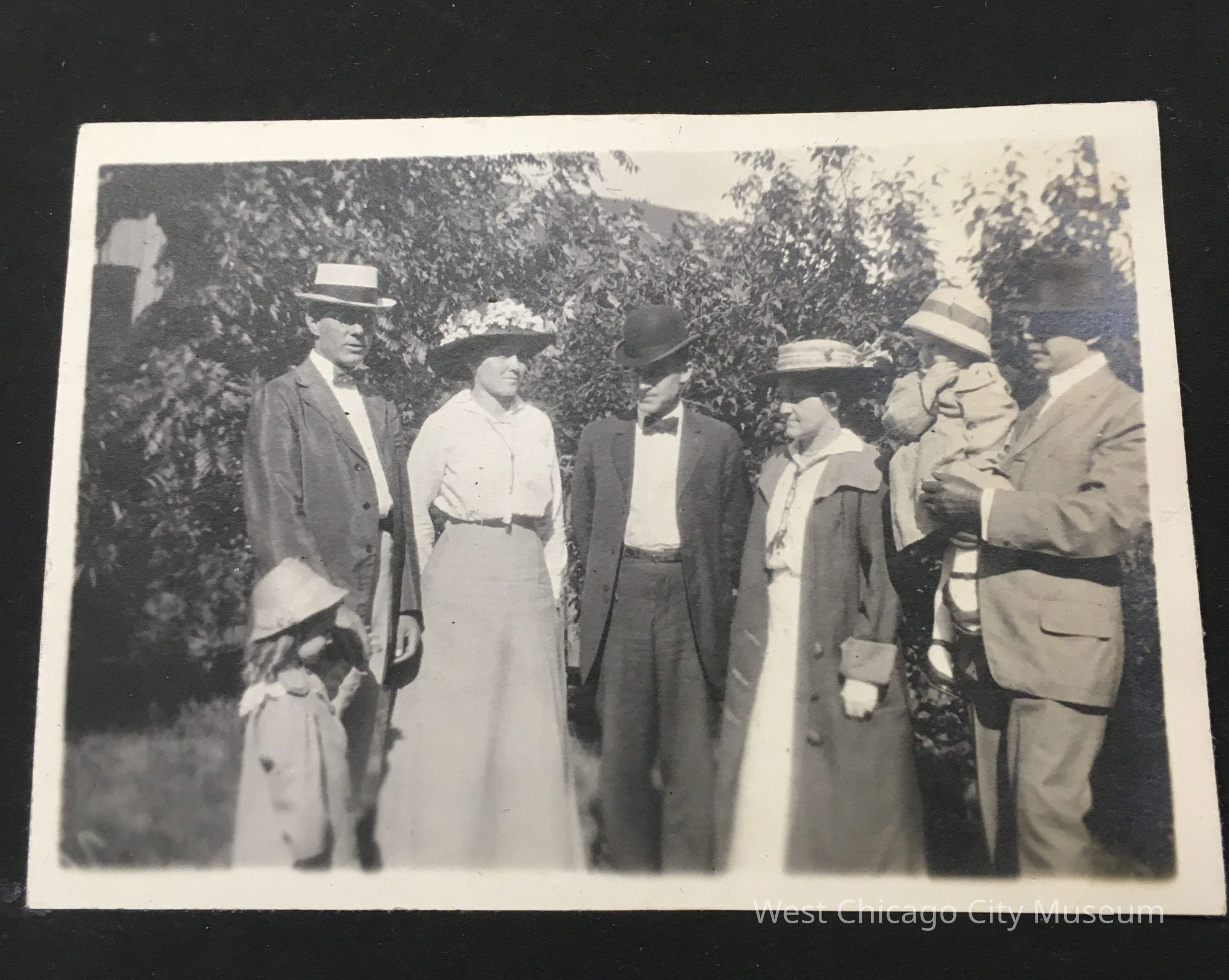 Photograph, Black and white, showing a group of men, women and children standing outside, all in hats and one woman in a long light overcoat. From left to right: Child (about 3) holding the hand of a man, woman, man, woman, and small child (about 2) being held by a man. Unidentified, from the Alexander family albumPhotograph Details