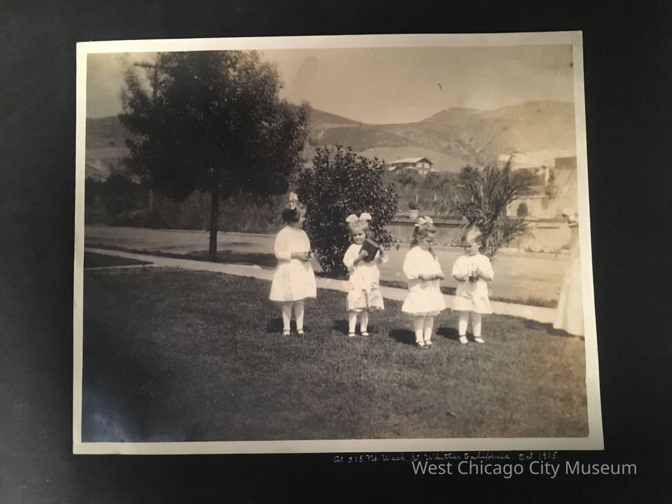 Photograph, black and white, of showing 4 children, possible 3 girls and a boy, in white dressed, in a line outside. They are each holding an object. There are palm trees and high trees in the background. Landscape orientation, pasted on black paper. Below reads "At 515 No. Wash. St. Whittier, California Oct 1915." Likely some are the children of Frances Brabrook - see researchPhotograph Details