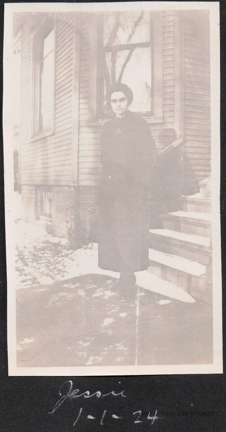 Photograph, Black and white, showing a woman with dark pulled up hair and a dark high necked dress standing at the bottom of steps leading into a home. There is snow on the ground. Photo is portrait orientation, and under exposed. Pasted on black paper and underneath reads "Jessie 1-1-24" Possibly Jessie Hayward Benjamin, see note.