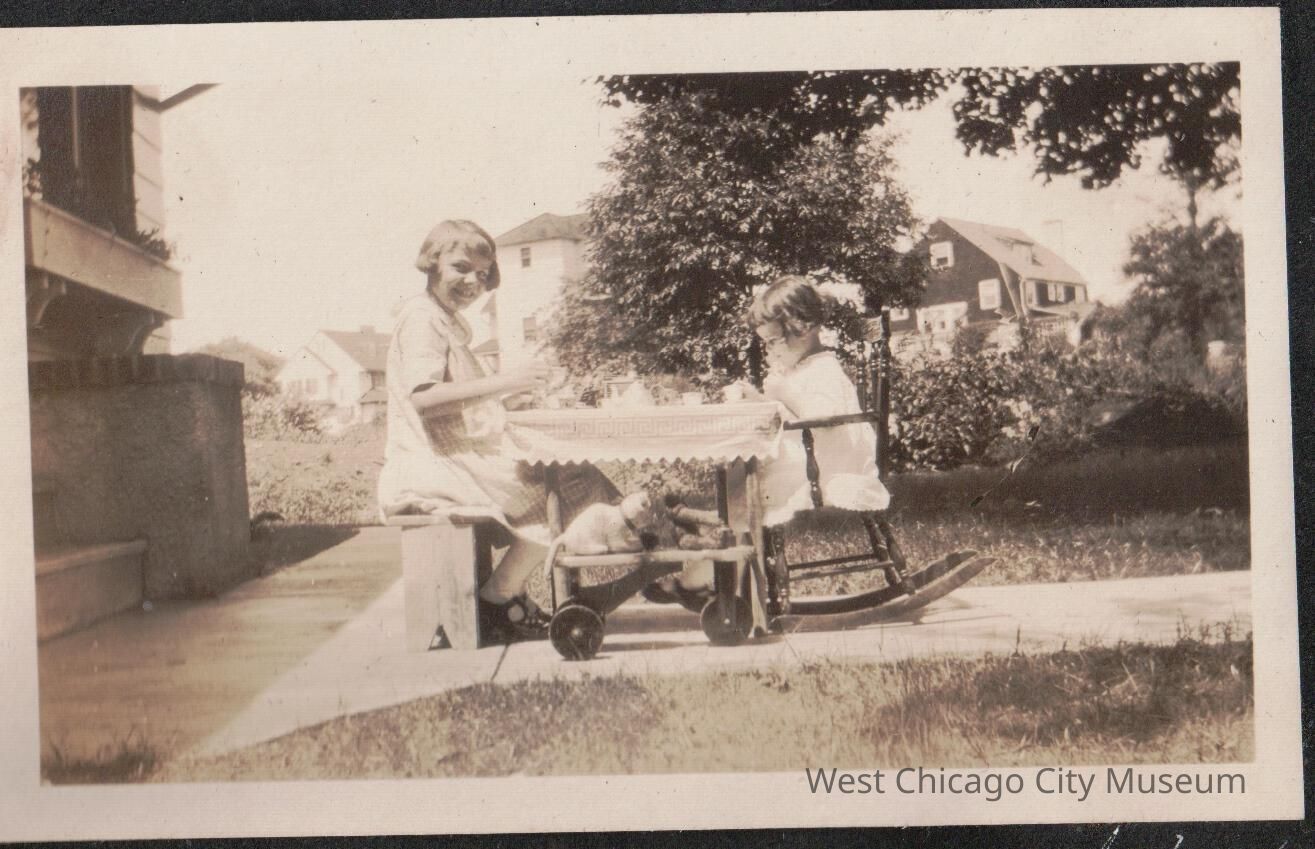 Olive and Arleen Alexander having tea party on front walk of house, tricycle and stuffed animals in front of table 6.29.1924. Olive is older than Arleen, and seated on the left and looking at the camera. Arleen is in a rocking chair. Both girls are wearing light colored dresses, and have bobbled hair.