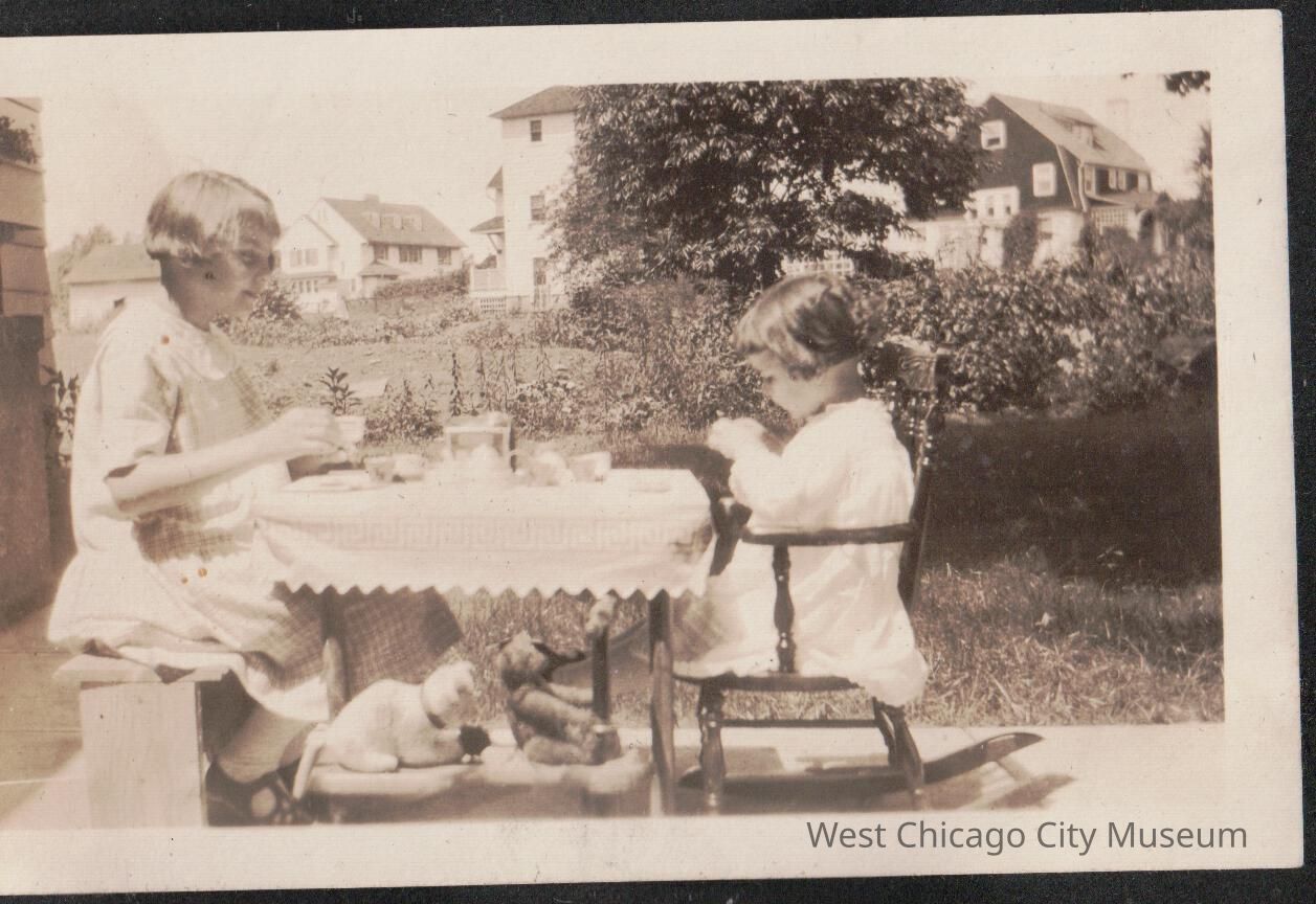 Olive and Arleen Alexander having tea party on sidewalk, teddy bear and stuffed cat beneath table. Olive is older than Arleen, and seated on the left. Arleen is in a rocking chair. Both girls are wearing light colored dresses, and have bobbled hair.