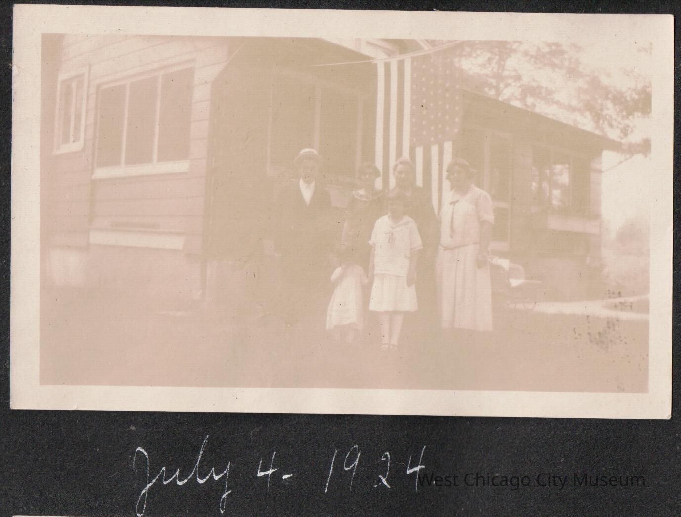 Photograph, black and white of a man, three women, man, and two girls in front of house with American flag hanging from a bracket above the enclosed porch. Dated 7.4.1924, Independence day. The small girl is possibly Arleen Alexander. The photo has a whitish sheen, possibly from poor development.Photograph Details