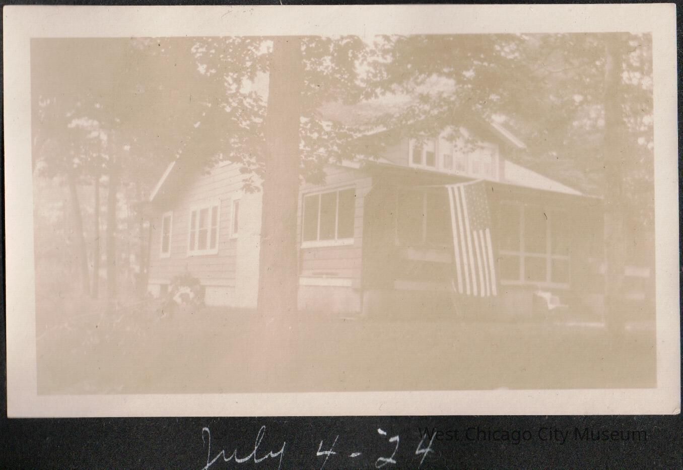 Photograph, black and white, showing the of side and front of two story bungalow with a large American flag hanging at corner, baby carriage in front, dated 7.4.1924. The photograph has a whitish sheen. Alexander family photo