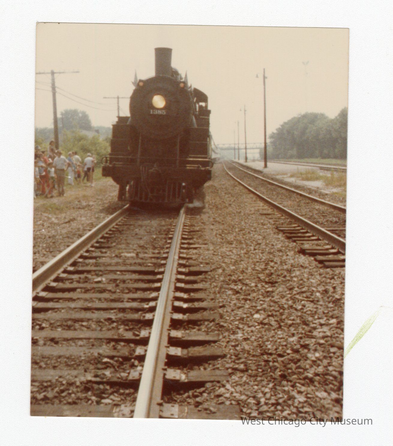 Color portrait oriented photograph of train on tracks heading straight towards photographer. Another set of tracks to the right. People gathered beside train along left edge of photo. 1385 number on train right under circular light. Writing on back Steamer at West Chicago 7-10-83Collection