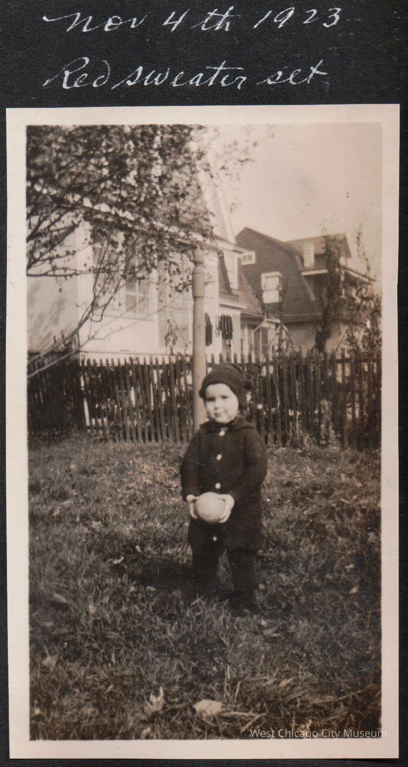 Photograph, black and white, showing Arleen Alexander in a long sweater set with white buttons and pants and a knit cap. She is standing on the grass, outside, holding a ball. There are other homes and a picket fence behind her. 11.4.1923 The photo is on black paper, from the Alexander family album. above the photo it reads "Nov 4th 1923 Red sweater set"