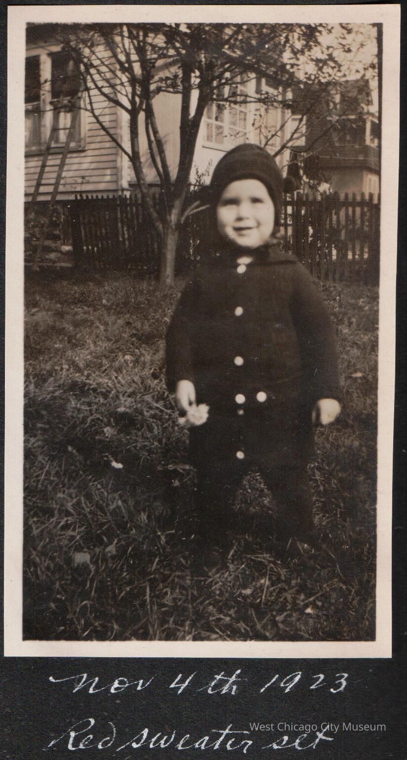 Photograph, black and white, showing Arleen Alexander in a long sweater set with white buttons and pants and a knit cap. She is standing on the grass, outside, holding leaves or flowers. There are other homes and a picket fence behind her. 11.4.1923 The photo is on black paper, from the Alexander family album. below the photo it reads "Nov 4th 1923 Red sweater set"