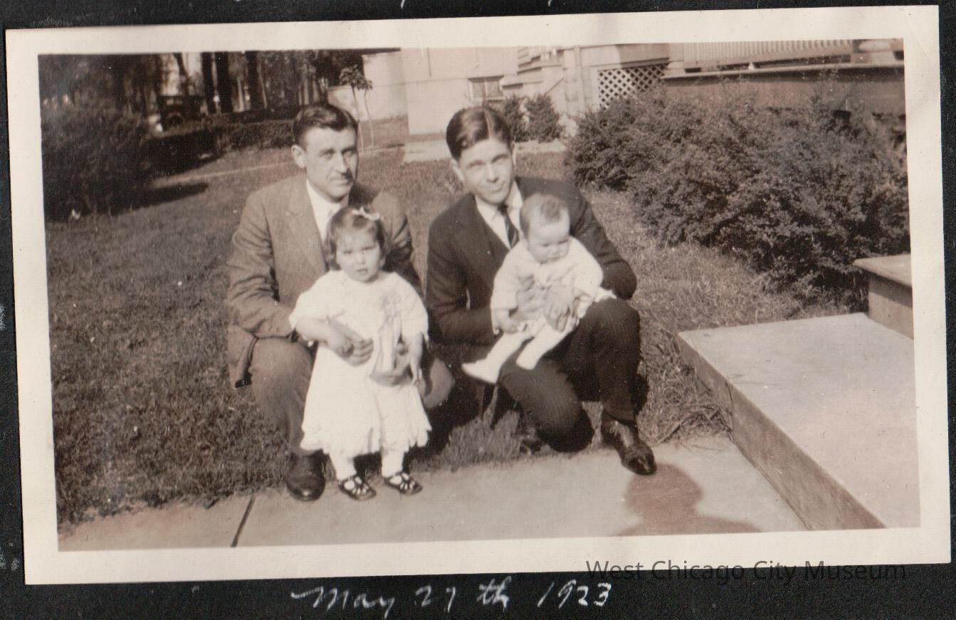 Photograph, black and white, showing George Holinan holding baby Jimmy (right side) and Kern Alexander holding Arleen (left side) in front yard 5.27.1923. The men are both in suits.