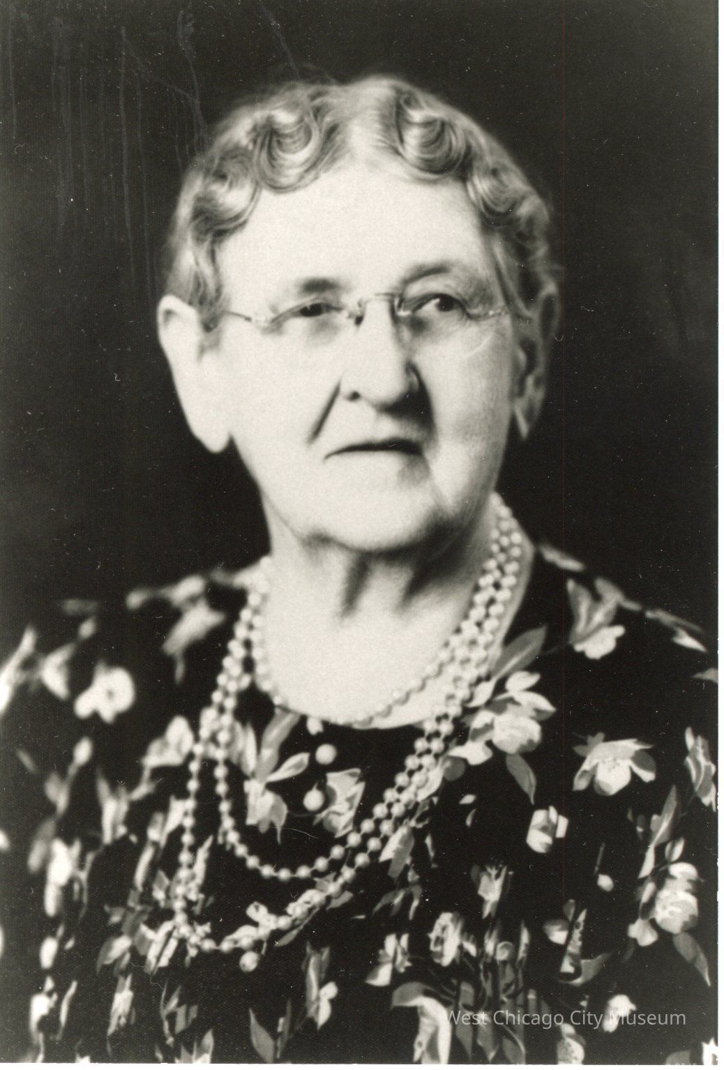 Photograph, black and white, of Mrs. Alice Wagner Kuhn, wife of Aaron A. Kuhn. She's an older woman with rimless glasses, and wavy hair tight to her head. She is wearing a three strand necklace with a dark dress with flowers.