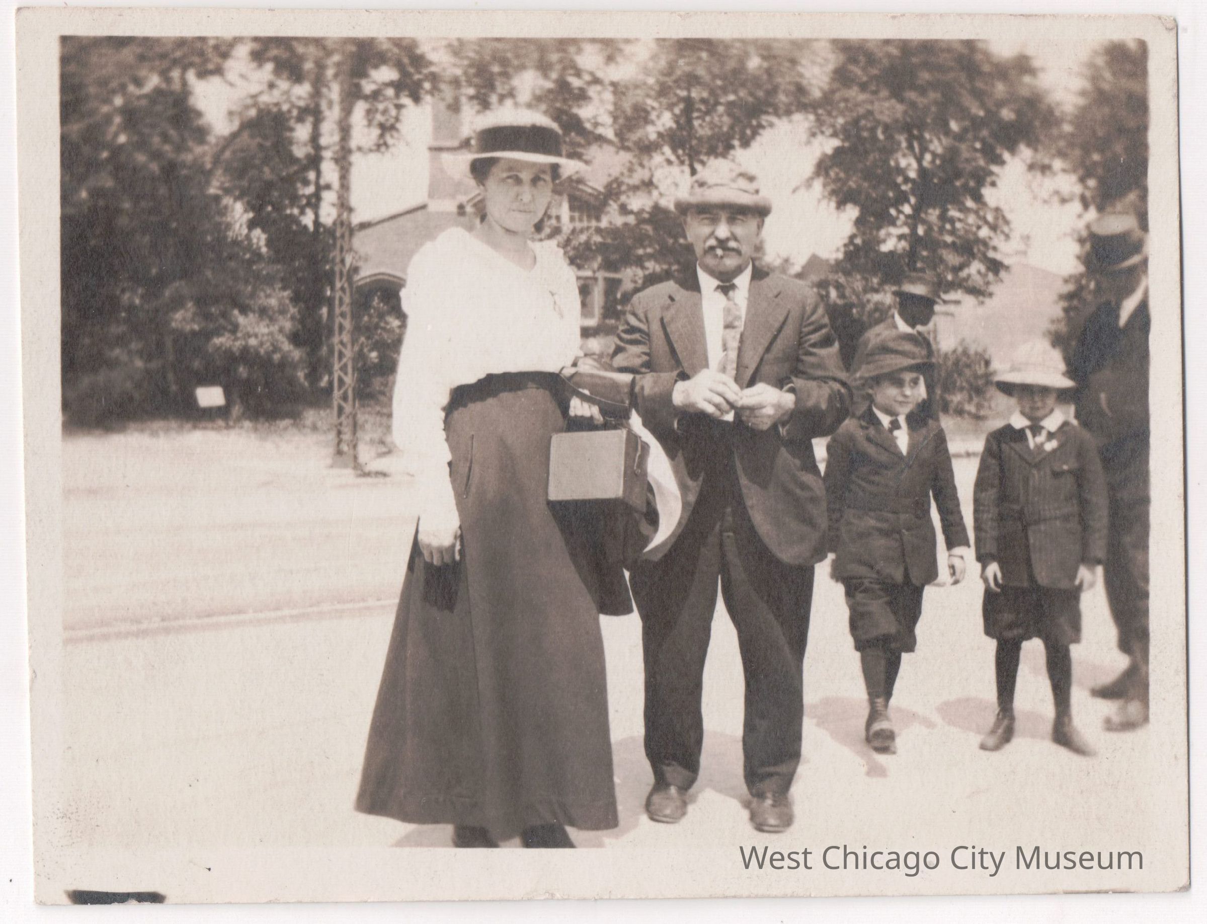Photo, Black and white, showing (l to r) Mrs. Etta Mulligan and Mr. Mahar, Jim Mulligan, Howard Mahar and an unknown man standing outside on a summer day. c.1915. Everyone is wearing a hat, and the boys are in short pants. There is a large building behind them, distinctive architecture, but unknown location. Landscape orientationPhotograph Details