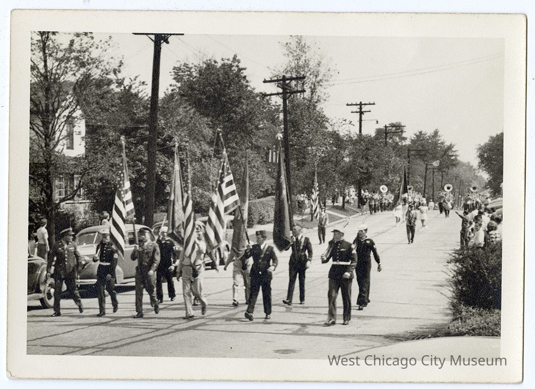 Shows a group of men in military uniforms walking with the flags; likely the color guard. behind them is the start of the marching band; majorettes and tubas are visible. Back marked "A7355 #9" and Photo was taken by Wolfmann Studio, Geneva
