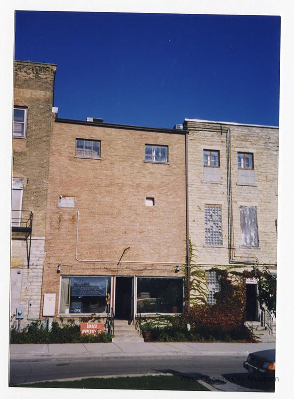 Photograph, color snapshot, showing buildings along Turner Court in West Chicago. Shows the back side of the Isaac's Upholstery (134 Main), which is a brick building with large windows on each side of the door way, and two smaller windows near t he roofline. Photo is taken from the opposite side of Turner Court. The West Chicago City Museum is on the left side. It's a beautiful cloudless day. Portrait orientation, printed on Kodak Paper