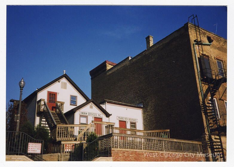 Photograph, color snapshot, showing the backside of 128 and 130 Main from Turner Court in West Chicago. Photo is taken to the left, at an angle. Both addresses are in the same white building with red doors. 128 Main is Lincoln Services, and 130 Main is Prairie Path Insurance. The side of the West Chicago City Museum is visible as well. The building are at the top of a stairway that leads Main street. Landscape orientation, printed on Kodak Paper.