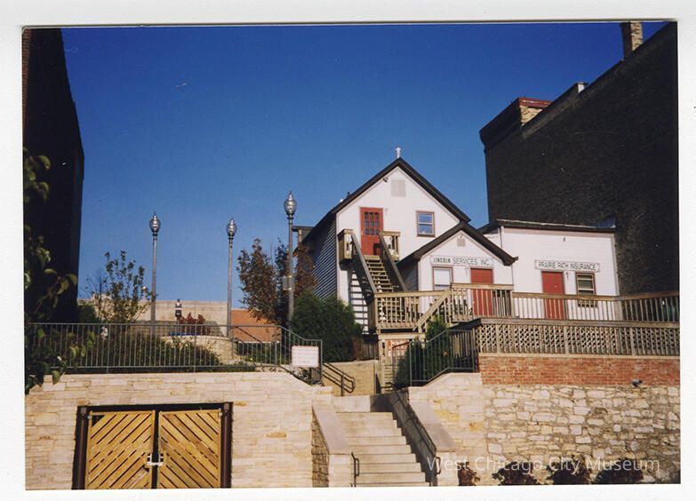 Photograph, color snapshot, showing the backside of 128 and 130 Main from Turner Court in West Chicago. Bothe addresses are in the same white building with red doors. 128 Main is Lincoln Services, and 130 Main is Prairie Path Insurance. The building are at the top of a stairway that leads to the WTCU Fountain and Main street. In the bottom left of the photo at street level are wooden doors that lead to storage. Landscape orientation, printed on Kodak Paper.