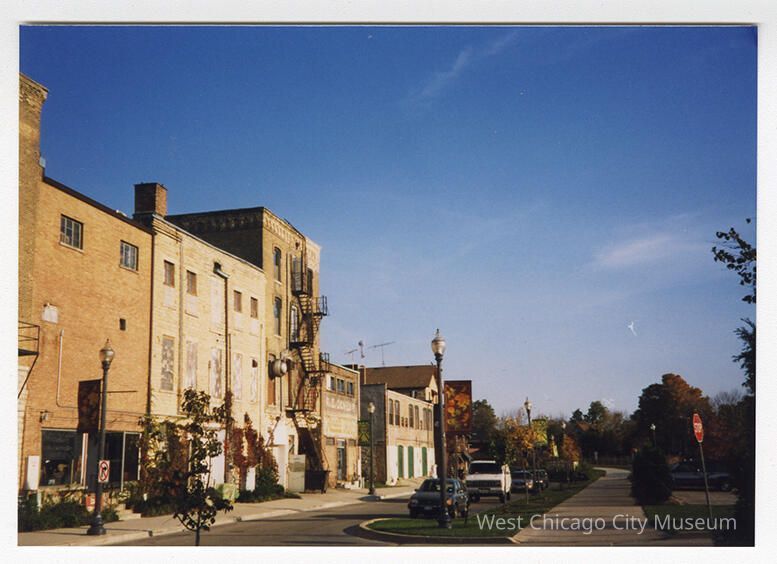 Photograph, color snapshot, showing buildings along Turner Court in West Chicago. Looking south from across the street from the West Chicago City Museum (132 Main), showing the backside of a line of buildings. There are cars parked on the opposite side of the street from the buildings, and the photographer is standing at the entrance to the parking lot on the south side of the street. It's a beautiful cloudless day. Landscape orientation, printed on Kodak Paper.