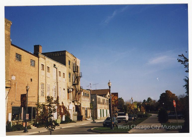 Photograph, color snapshot, showing buildings along Turner Court in West Chicago. Looking south from across the street from the West Chicago City Museum (132 Main), showing the backside of a line of buildings. There are cars parked on the opposite side of the street from the buildings, and the photographer is standing at the entrance to the parking lot on the south side of the street. It's a beautiful cloudless day. Landscape orientation, printed on Kodak Paper.