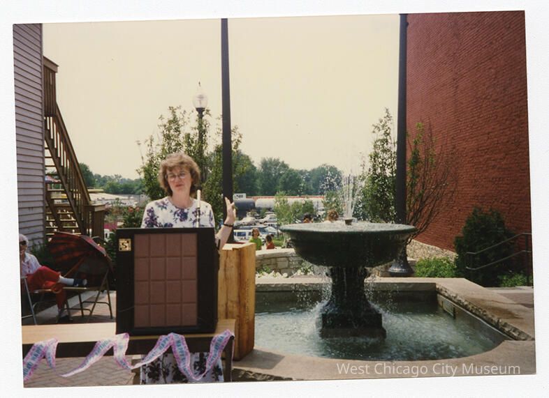 Photograph, color snapshot of a the Women's Christian Temperance Union (WCTU) fountain 100 year celebration on Main street. Landscape orientation. Shows Museum director LuAnn Bombard to the left of the fountain, who is gesturing at it as she speaks. Photo is printed on Kodak paper