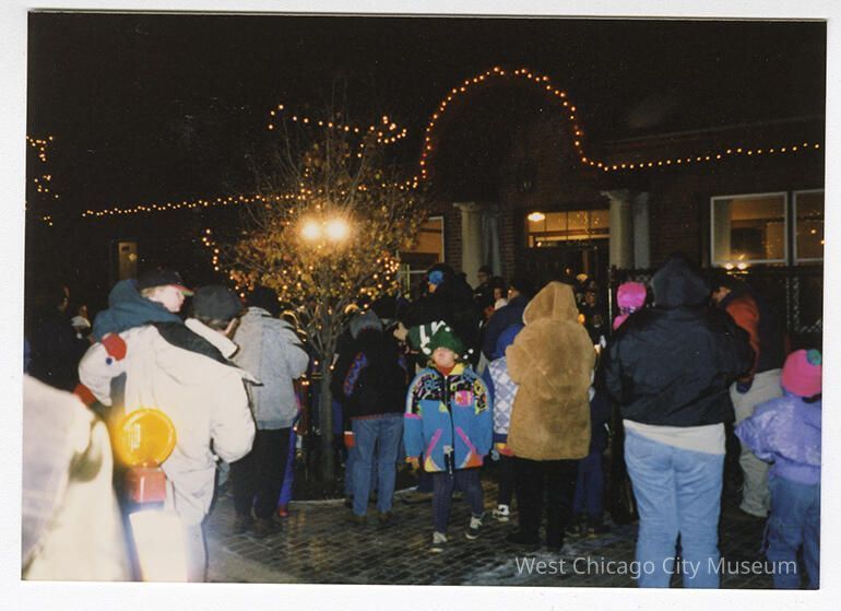 Photograph, color snapshot of a Christmas / Frosty Fest event. The photograph is taken at night, landscape orientation. A group of people is standing in front of, and most looking towards the Fox Community Center. The building and bare tree in front are festooned with lights. Printed on Kodak paper.