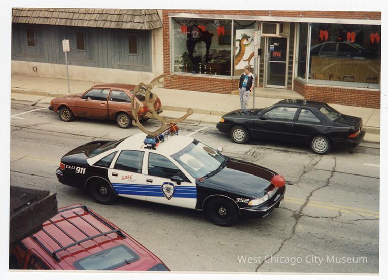 Photograph, color snapshot of a Christmas / Frost Fest Parade. Shows a police car with antlers strapped to the hop of the lights on the roof of the car. Photo taken from the second floor of the West Chicago City Museum. The buildings across Main street are visible (the American Legion at 123 Main street, and 129 Main Street). Printed on Kodak paper.