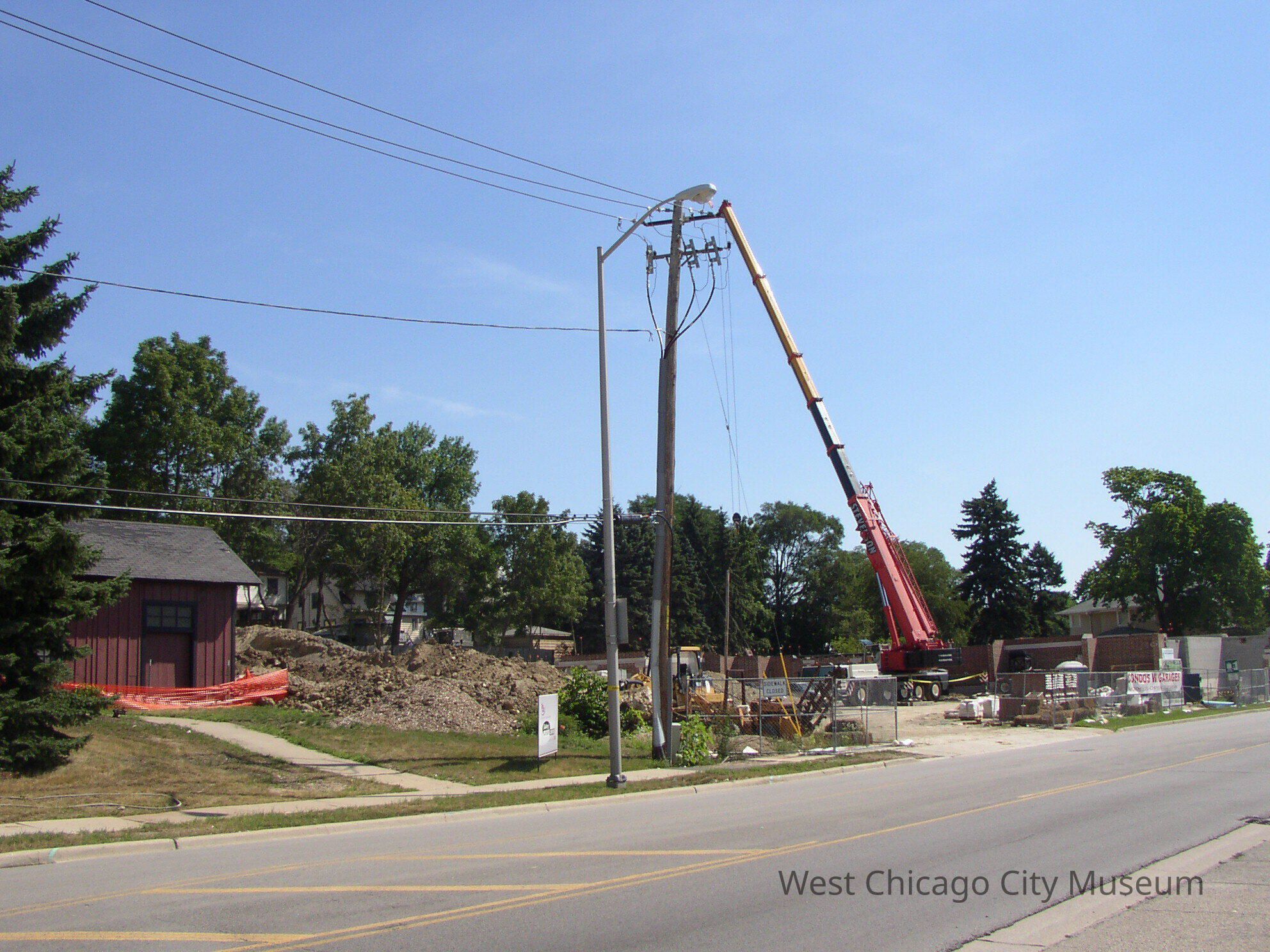 Photograph, Born digital, of the Historical Preservation Images from July 2005. Color, landscape format, jpg file type. Shows the Aurora Branch Depot, a small, one story red wooden building with a shingled roof and wide door opening with orange plastic fencing around it on left next to a large construction site for the The Gallery @ Gateway Centre at 515 Main street, scheduled to open Fall 2005. There is a large utility pole in front of the building. The building is painted red, and is reminiscent of a railway station or old garage. There is a tall crane in the construction site; building foundations visible. Taken from across Main street, between Route 59 and Wilson Ave, West Chicago.Photograph Details