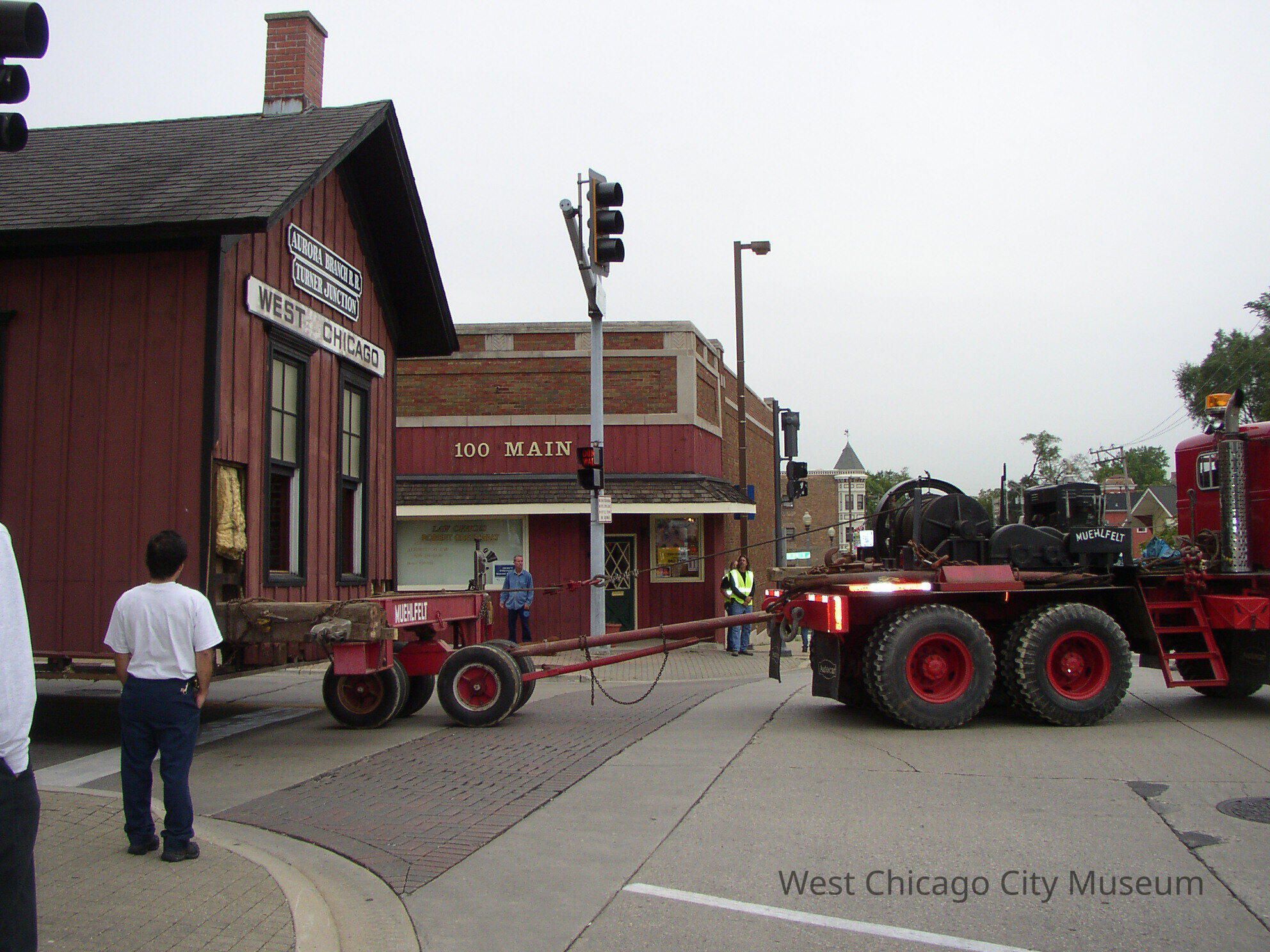 Photograph, Born Digital, 2005 1860s CB&Q Depot Move. Color, Landscape format, .jpg file type. Image modified January 1, 2002. Shows the 1860s West Chicago / Turner Junction Depot on a flatbed attached to a semi truck driving down Main Street, turning left (south) on W. Washington Street.. Photo is taken from the northeast corner of the intersection. 100 Main Street building (1 story, brick, on the Southeast corner of the intersection) is visible. The semi-truck marked "Muehlfelt". The Depot is in the process of being moved from its old location on Main street to the new location on Turner Court.Photograph Details