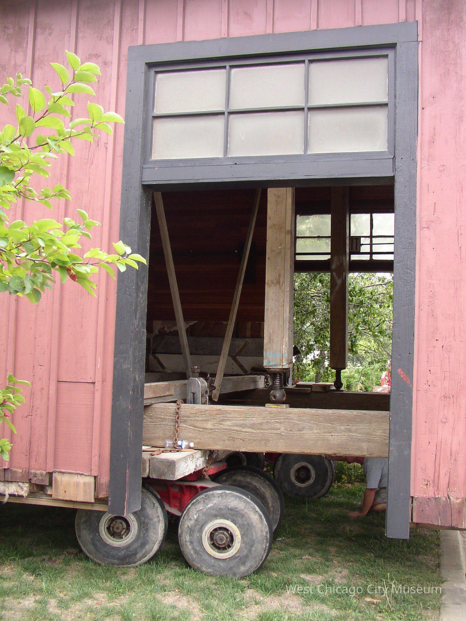 Photograph, Born Digital, 2005 1860s CB&Q Depot Move. Color, portrait orientation, Landscape format, .jpg file type. Image modified January 1, 2002. Shows the 1860s West Chicago / Turner Junction Depot on a flatbed trailer. Photo is a detail shot taken through the large freight door opening with a transom above it, showing how the building is supported with large wooden beams. There is a man in a t-shirt kneeling under the Depot behind the back axle. The Depot is in the process of being moved from its old location on Main Street to the new location on Turner Court.Photograph Details
