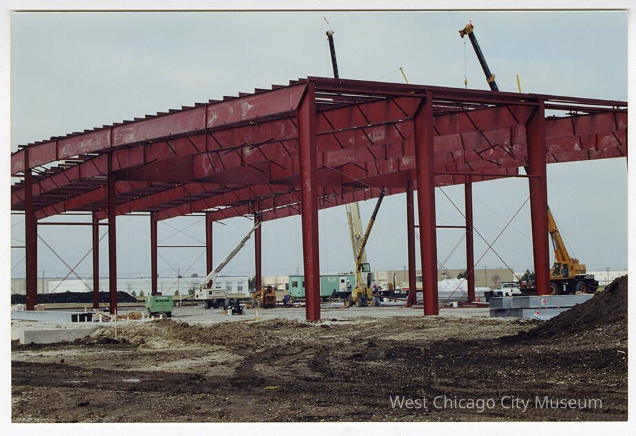 Photograph, colored image of construction at the DuPage Airport. Shows a skeletal red frame of a flat topped building - possibly a hangar? Behind the structure are two cranes, one white and one yellow. There is a teal construction trailer as well. 4x6 inches