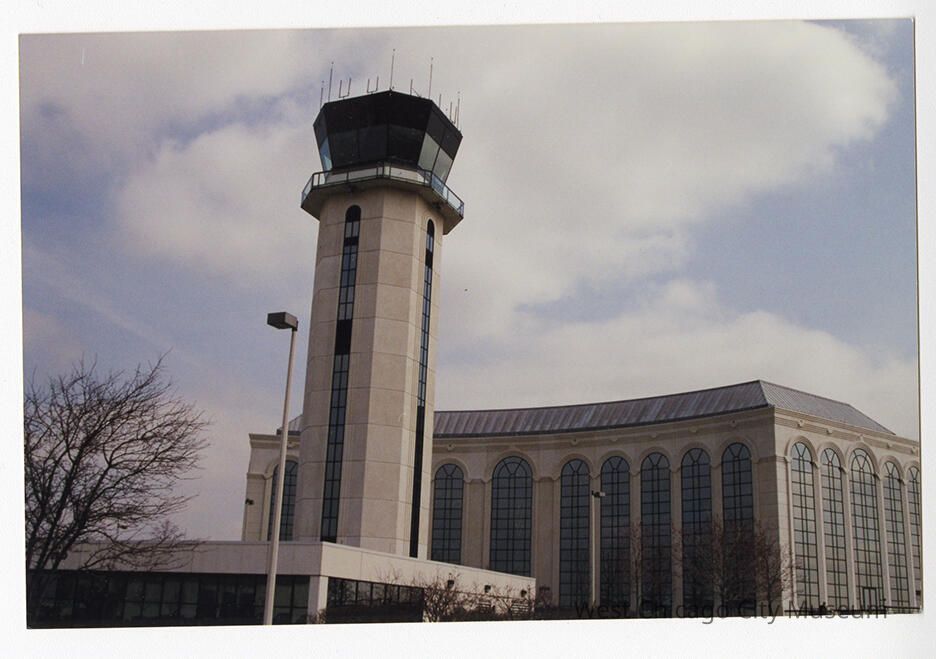 Photograph, colored image of the DuPage County Airport. Shows the control tower with a curved building with tall windows behind.