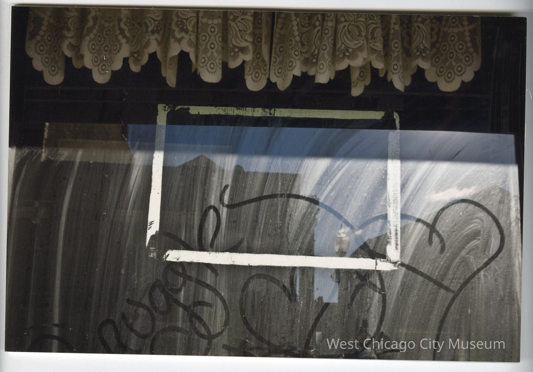 Photograph, color, close up of a window that has a whitish film (soap?) on it, with "_ruggles" and hearts drawn on it. Upper edge has a lace curtain and there is a taped white rectangle in the center. The image is mounted on a 11.75 x 7 7/8 inch dense foam core for display purposes. Made as part of "Sense of Place", a 2015 exhibit created Diana Velasco's West Chicago art residency, sponsored by the West Chicago City Museum and People Made Visible.Made/Created