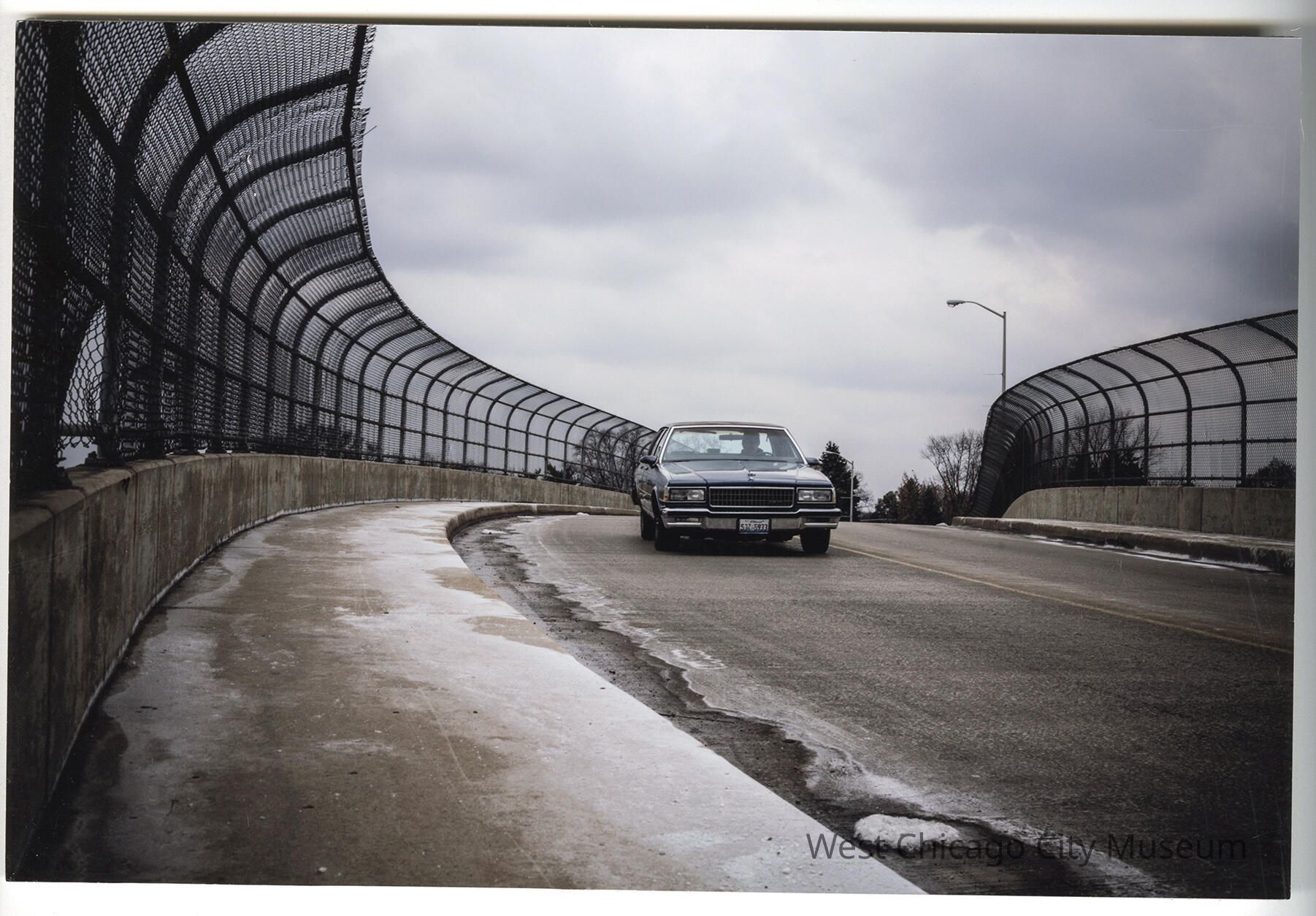 Photograph, color, shows a 1980s model car driving on the Wilson Avenue Bridge. It is winter and there is salt residue on the road and sidewalk. The image is mounted on a 11.75 x 7 7/8 inch dense foam core for display purposes. Bridge was built by 1987. Made as part of "Sense of Place", a 2015 exhibit created Diana Velasco's West Chicago art residency, sponsored by the West Chicago City Museum and People Made Visible.Photograph Details