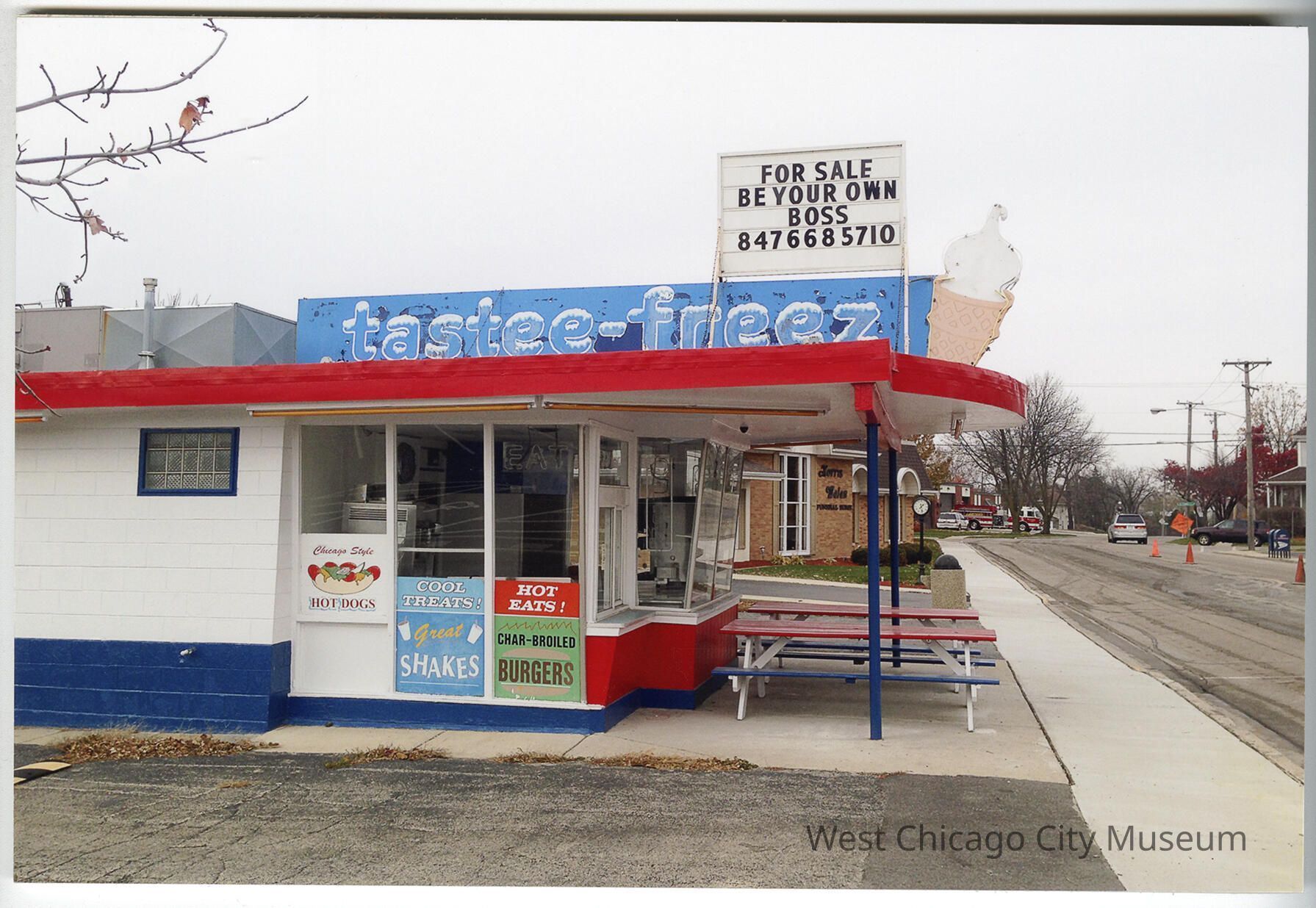 Photograph, color, shows the ice cream shop tastee-freez, the Norris-Walen Funeral Home and the fire department on Fremont Street. The Tastee-Freez Freeze has a sign above that reads "For Sale Be Your Own Boss 8476685710." The image is mounted on a 11.75 x 7 7/8 inch dense foam core for display purposes. Taken pre 2006 - see notes. Made as part of "Sense of Place", a 2015 exhibit created Diana Velasco's West Chicago art residency, sponsored by the West Chicago City Museum and People Made Visible.Photograph Details