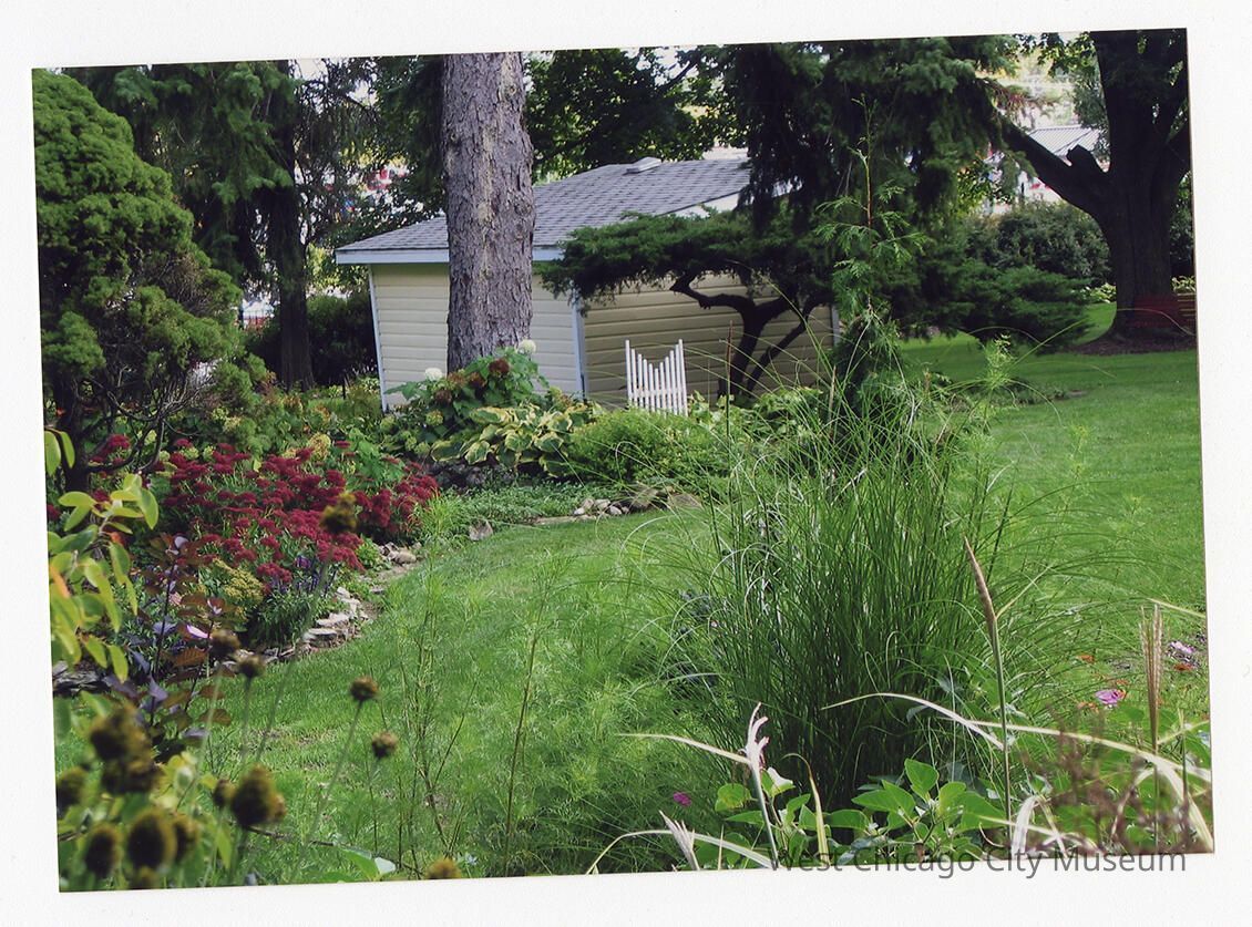 Photograph, color, showing the Kruse Museum Garden in the summer. Shows the sidewalk at the edge of the museum, with stains around the back side. There is a mulched bed next to the house with small red flowers. In the lawn is a bed of hostas and hydrangeas among various plants. 7x5 inches, landscape orientationPhotograph Details