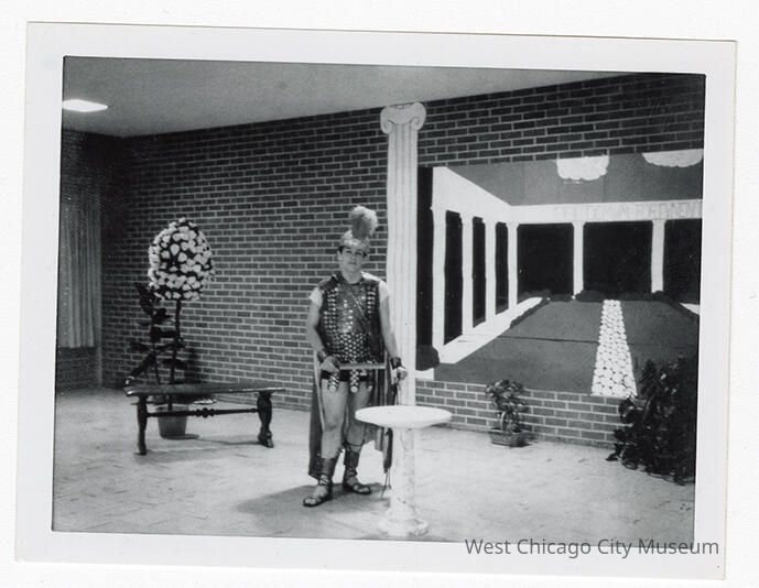 b- Photograph, black and white, showing a teenage boy dressed as a Roman centurion with a sword. Image of a series of columns on the wall behind them. Back reads "Frank Hill 1963"